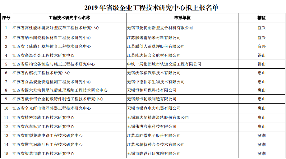無(wú)錫市2019年省級企業(yè)工程技術(shù)研究中心擬上報結果的公示